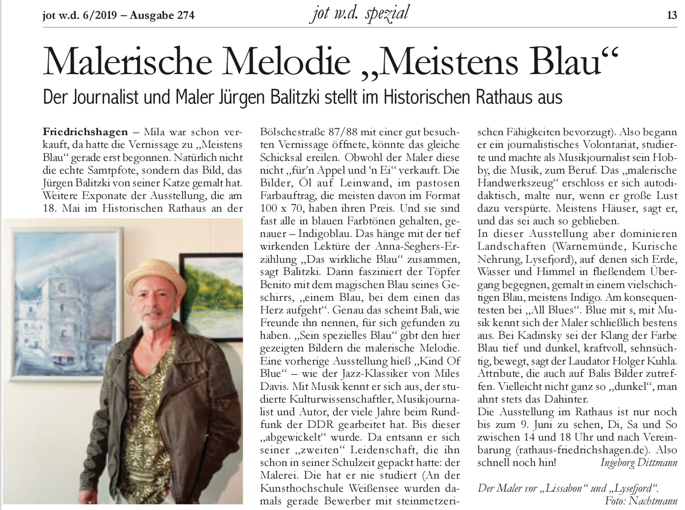 Berge oder Meer — diese Urlaubsfrage aller Fragen hat Jürgen Balitzki klar entschieden. Er mag keine Barrieren, er braucht den uneingeschränkten Blick, und so treibt ihn die Sehnsucht immer wieder aufs Meer, auf Gewässer, hinein in Landschaften, weit hinaus, wo sich Erde, Wasser und Himmel begegnen in einem unermesslich-vielschichtigen Blau: meistens Indigo.