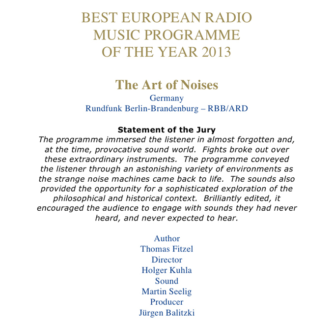 Das Feature „Die Kunst der Geräusche“ ist eine originelle, klangintensive Reminiszenz an die spektakulären Ideen des italienischen Futuristen Luigi Russolo. Dessen 1913 veröffentlichtes Manifest „L’arte dei rumori“ führte der Welt erstmals eine musikalische Praxis vor, die Jahrzehnte später von John Cage auf den berühmten Satz gebracht wurde: „Leben ist Musik, Musik ist Leben“. Was in Italien begann, führte über die russischen Avantgardisten in den frühen 20ern, die französische Musique Concrete in den 40ern, die Rockmusik eines Jimi Hendrix in den 60ern, den gezügelten Krach der Berliner Band Einstürzende Neubauten in den 80ern bis zu Techno-DJs von heute. Und so beamt das Feature die Zuhörer zu historischen und aktuellen Wirkungsstätten der Klangtotalisatoren: zu einem Skandal-Konzert nach Mailand, zur bolschewistischen Sirenensinfonie nach Baku oder zum Elektronik-Musiker Schneider TM, der den grässlichen Baulärm einer Ostberliner Sanierungszone in eine sechsteilige Geräuschsuite verwandelte. Die spielerisch-experimentelle Regie von Holger Kuhla hat dem objektiven Drang, eine asymmetrische Soundbestie zu schaffen, erfolgreich widerstanden und stattdessen der hohen Kunst des amüsanten Bildungsradios Tribut gezollt.