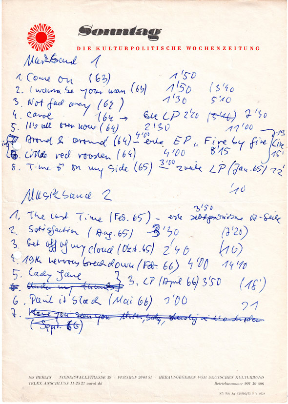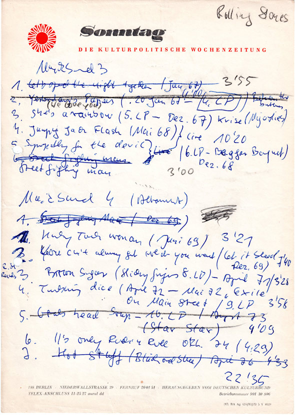sagte mir mein Chef von der Redaktion Kinder-, Jugend- und Tanzmusik (KJTM), die das Musikprogramm von DT 64 zu bestücken hatte. Mich erinnerte dieser Dialog an den schönen alten Witz über das Fehlen von Aal in Fischläden der DDR. Niemand fragte danach, also gab es keinen. Die Rolling Stones waren immer mal wieder in Ungnade gefallen. Zum ersten Mal 1965, als die Waldbühne zerdroschen wurde. Irgendeinen Grund gab es immer, um allgemein zugängliche Tonbänder aus dem Schallarchiv verschwinden zu lassen. Sie landeten vorübergehend im Giftschrank oder wurden entmagnetisiert. Das traf nicht nur die Stones, sondern auch Biermann, Lindenberg und alle flüchtigen oder ausgereisten Musiker. Weil 1978 mal wieder danach gefragt wurde, setzte die oberste Riege des Rundfunks der DDR an der Nalepastraße das Problem Rolling Stones auf die Tagesordnung. Komischerweise konnte sich niemand erinnern, wann und warum die Stones in den frühen Siebzigern auf dem Index gelandet waren. Beschluss: ganz langsam beginnen, ab und zu ein Titel im Nachmittagsprogramm (ohne Anmod), dann vielleicht ein ideologisch kluger Beitrag am Abend und später, wenn man sich der Normalität genähert zu haben glaubte, das große Angebot zum Mitschneiden in der beliebten Sendereihe DUETT – MUSIK FÜR DEN RECORDER. Fast zwei Stunden Rolling Stones. Die Reaktion der Hörer war überwältigend.